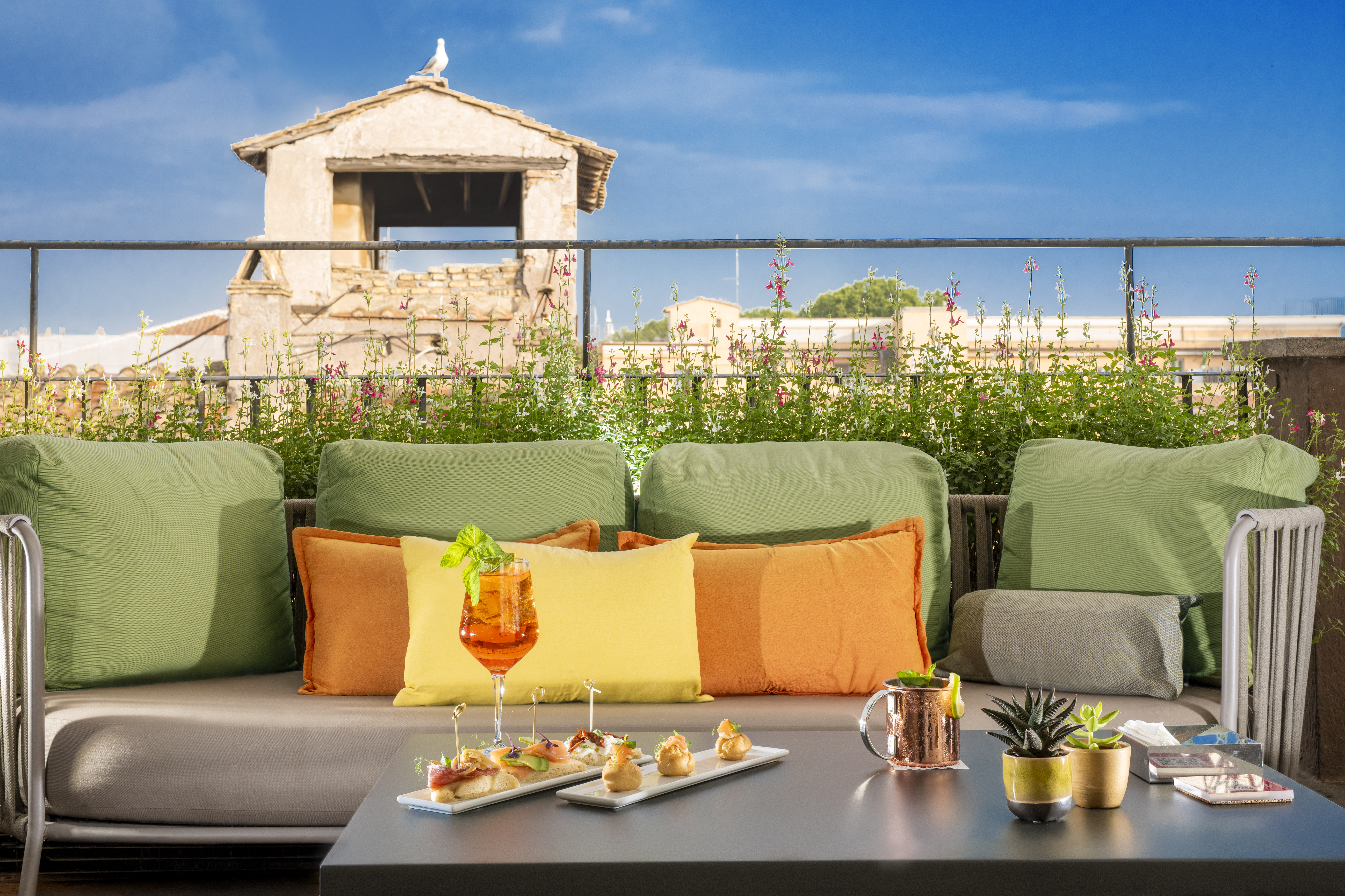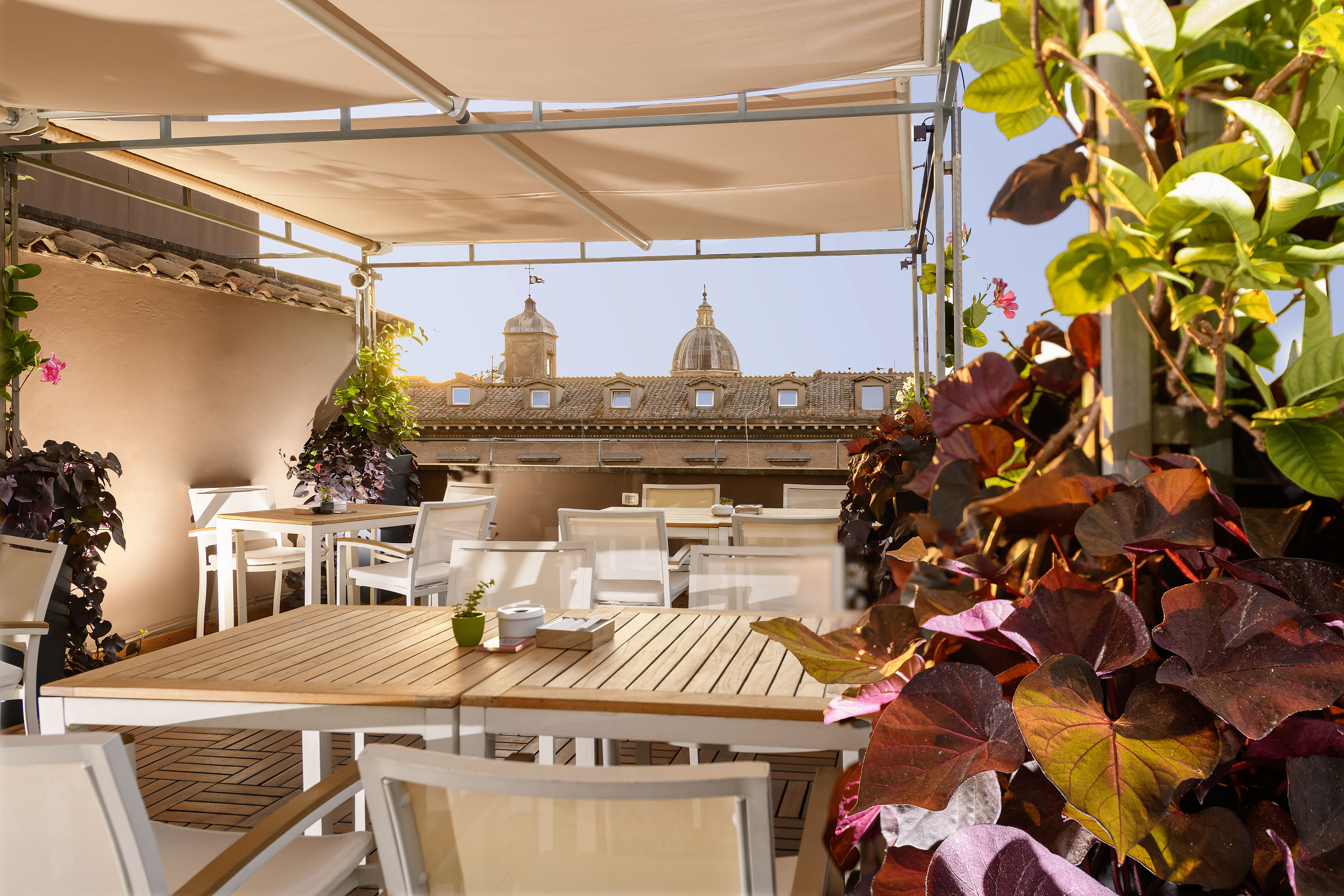 Il Roof Terrace si trova all'ultimo piano dell'hotel e offre una vista incantevole sulla capitale. Godetevi le miti temperature romane e lasciatevi incantare dal suggestivo scenario che vi circonda fatto di affascinanti cupole e tetti.